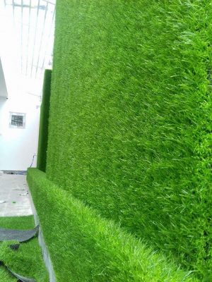 Cuối cùng bạn đi đến bước thi công. Công việc này tốt nhất cần có hai người trở lên để hỗ trợ nhau. Trước khi dán bạn nên kiểm tra mặt tường có bị ướt hay có vấn đề gì không, nếu bình thường thì tiến hành cắt các tấm cỏ theo kích thước đã tính toán.