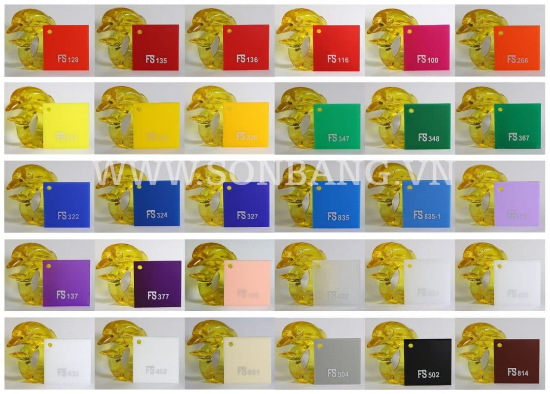Màu sắc: FS135 màu đỏ, FS100 hồng, FS266 cam, FS235, FS226, FS347 xanh lá cây, FS327 xanh da trời đậm, FS322 xanh nước biển nhạt, FS425 trắng sữa, FS402 trắng sành, FS348 xanh lá đậm, FS814 màu nâu trà, FS504 xám khói, FS502 đen, FS835 xanh nước biển nhạt, FS000 trong suốt, trong kính.